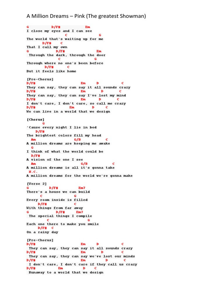 A Million Dreams The Greatest Showman Guitar Chord Chart In G