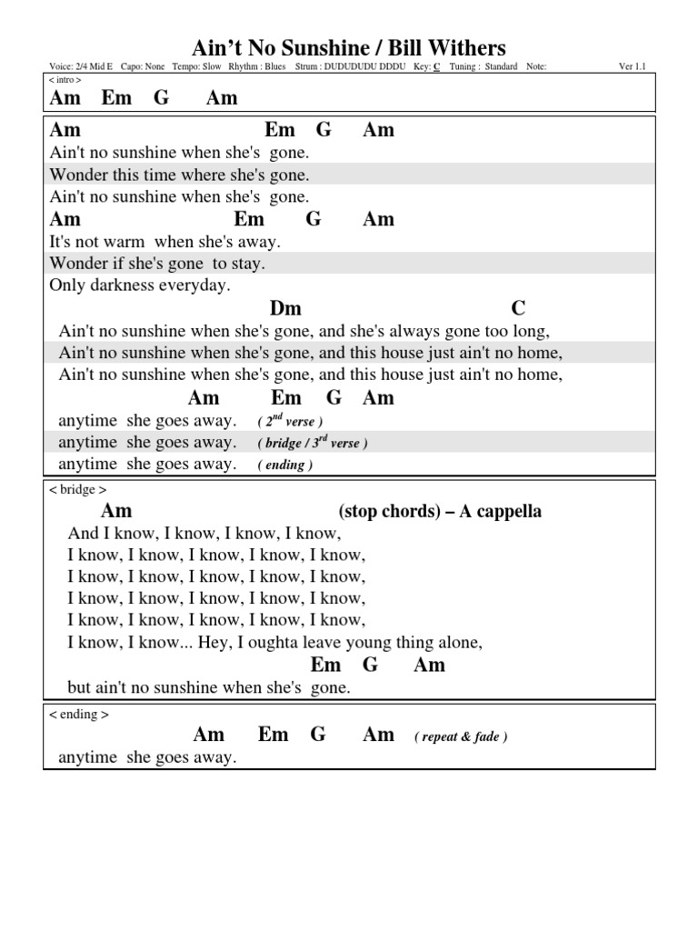 Ain T No Sunshine By Bill Withers Guitar Chords Lyrics Guitar