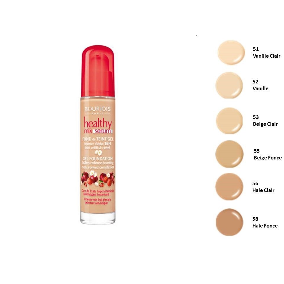 Bourjois healthy mix anti fatigue foundation 50 rose ivory gives you a rested natural glow that will make your skin look healthy. Based on digital swatches the most similar shade in the bourjois healthy mix serum light coverage liquid foundation would be 52 vanilla. Bourjois healthy mix serum foundation merupakan foundation gel dengan campuran serum terapi buah yang kaya vitamin litchi pomegranate goji sehingga memberikan hasil yang alami dan radiant yang bertahan hingga 16 jam. Shop bourjois healty mix serum light coverage liquid foundation 53 light beige 30ml at amazon uk s beauty shop.