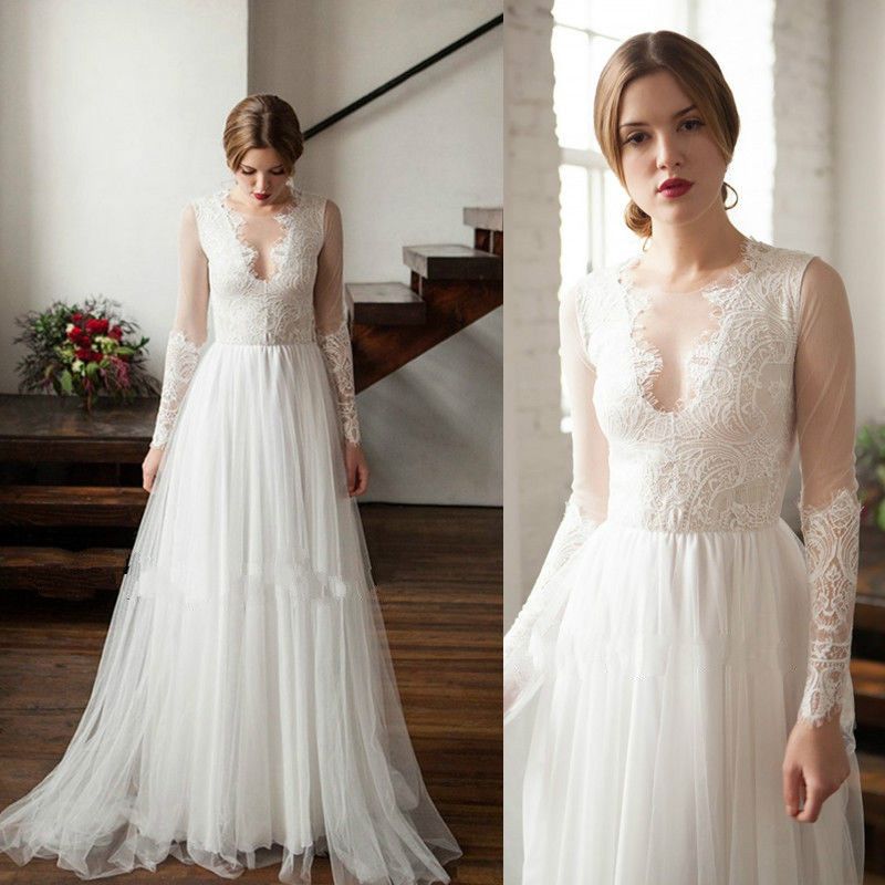 Princess Jewel Illusion Beach Long Sleeve Lace Wedding Dresses Floor Length Tulle Simple Country Bohemian Cheap
